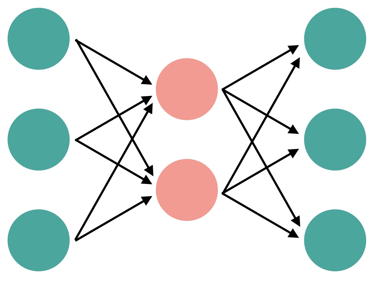 This model will have an encoder that compresses the data from 3 dimensions to 2, and then a decoder that expands from 2 back to 3 dimensions, as shown in the diagram below: