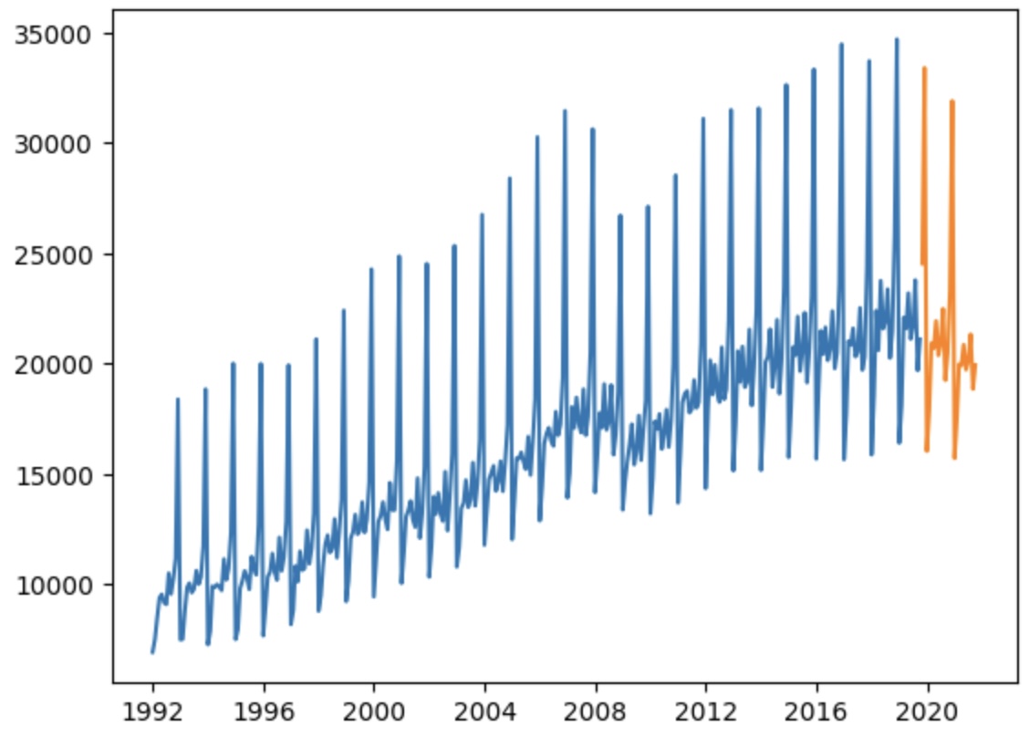 Finally, to evaluate the model, we can forecast predictions for test data range (the last 24 months of the entire dataset). We have to inverse the scaling transformations: